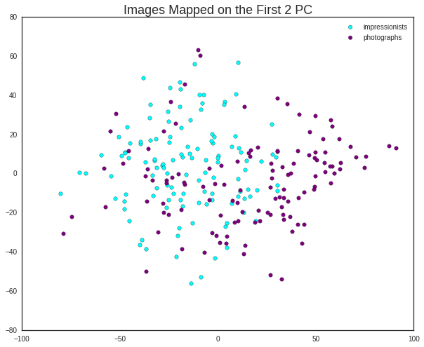 So, we use PCA to reduce the dimensionality of the data from 675,000 features to the 5 most important linear combinations of them. For illustrative purposes, below I present the first two ones, where we can already see that each set has unique characteristics (i.e. impressionists tend to be more ‘to the left’). A classifier with only these 2 dimensions will still make many mistakes, so adding a couple of extra ones should improve the performance (hence 5).