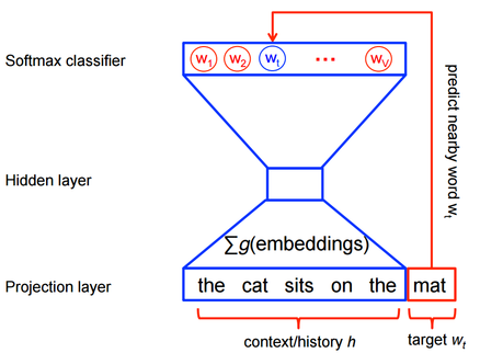 The goal is to create a model capable of predicting the most probable word \(w_t\) given a context \(h\). If we derive an informative vector representation of our words, we can use the softmax function to model this probability distribution: