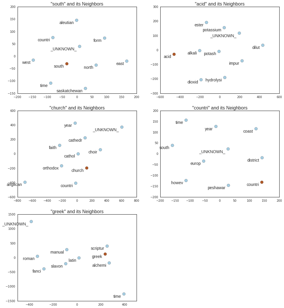 On the plots below we can see the closest neighbors to each of the test words, which in all cases make semantic sense.